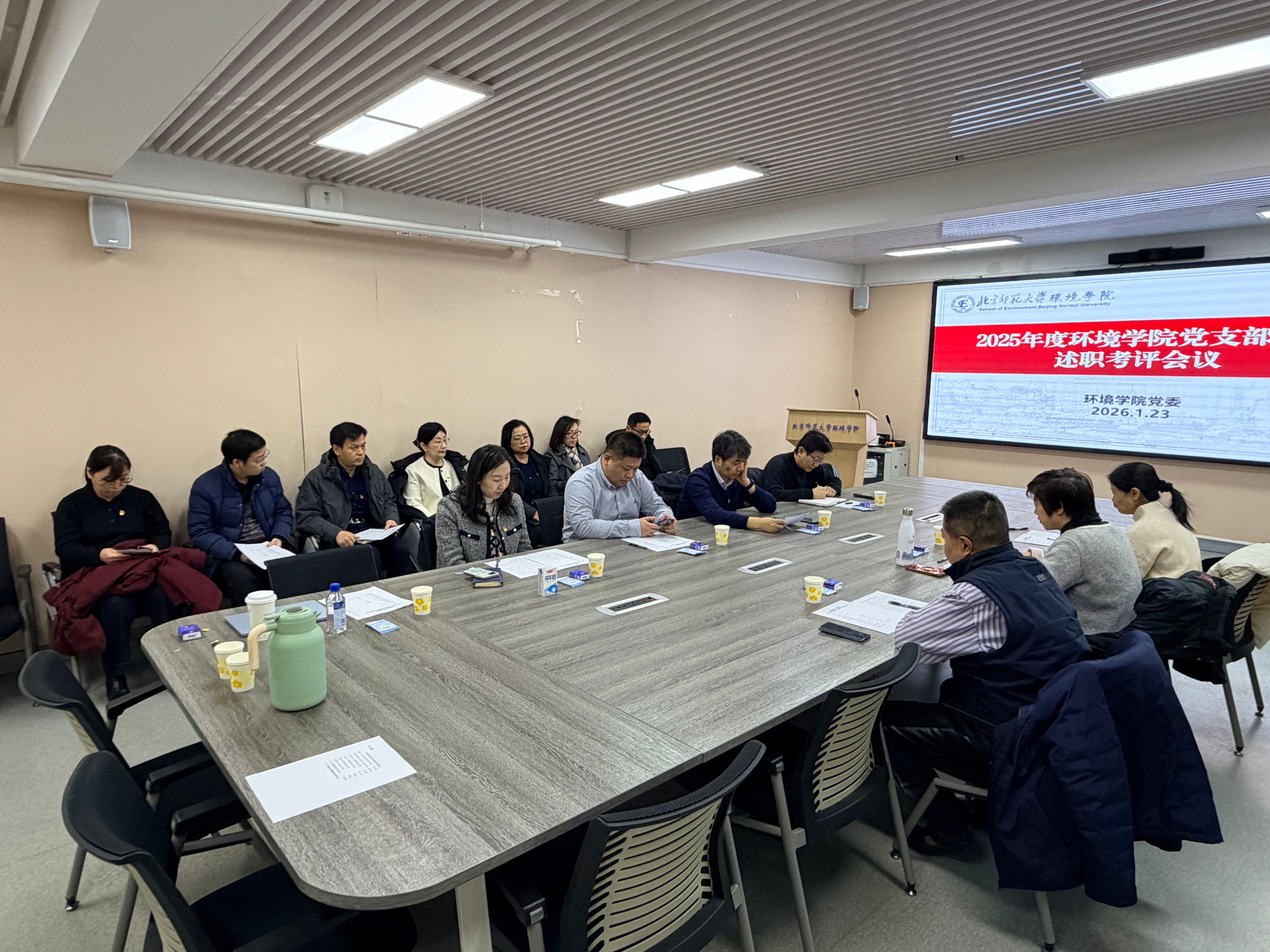 2026年1月23日,环境学院举办2025年度教工党支部书记述职评议考核会。学院党委书记徐琳瑜,院长沈珍瑶,党委副书记李习文,党委副书记张珺,党委委员、副院长孙涛,党委委员王烜,党委委员裴元生以及全体教工党支部书记参会。会议由徐琳瑜主持。