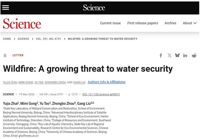 论文信息:Yujia Zhai et al., Wildfire: A growing threat to water security. Science 391, 1215-1215(2026). DOI:10.1126/science.aef6813