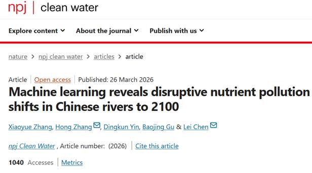 该研究成果以“Machine learning reveals disruptive nutrient pollution shifts in Chinese rivers to 2100”为题,于2026年3月发表在《npj clean water》。北京师范大学陈磊教授、中国科学院生态环境研究中心张洪研究员为通讯作者,中国科学院生态环境研究中心张潇月(北京师范大学获博士学位)为论文第一作者。交通运输部规划研究院印定坤、浙江大学环境与资源学院谷保静教授为论文合作作者。该研究得到了国家自然科学基金基础科学中心项目(52388101)资助。