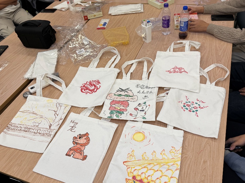 随后开展的是帆布袋创意涂鸦环节,活动现场准备了多种故宫经典纹样素材,供同学们自由挑选与参考。同学们根据个人兴趣选择自己喜欢的特色故宫元素,结合自身想法进行绘制。参与者们充分发挥自身的匠心巧思让传统纹样在帆布袋上焕发出新意与朝气。