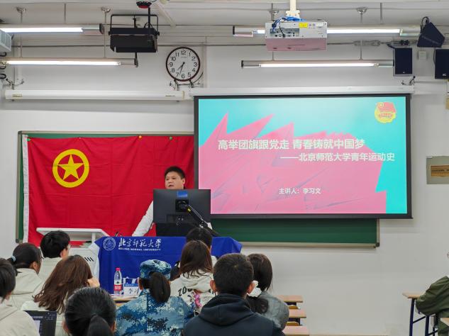 开营仪式后,由李习文老师以 “高举团旗跟党走・青春铸就中国梦—北京师范大学青年运动史” 为题开展首场讲座。他以时间为轴,将北师大百年校史与青年运动深度融合,划分四个关键历史时期,用鲜活故事再现不同时代北师大学子的担当。讲座尾声,李习文寄语学员接过前辈 “接力棒”,以青春之力续写中国梦新篇章。