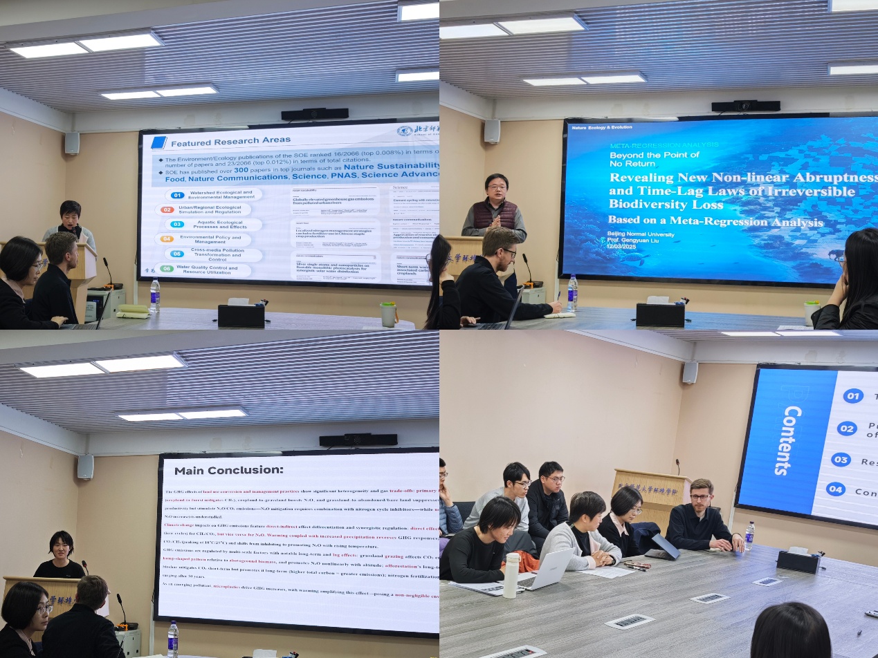 在温轶凡老师进行简要开场及嘉宾介绍后,徐琳瑜书记介绍了环境学院基本情况及《自然·生态与进化》与我院研究方向的契合点。之后分别由刘耕源副院长及博士研究生代表进行了特色研究汇报,展示了学院在生态与可持续发展领域的最新探索。汇报内容扎实、视角新颖,体现了学院的研究特色与学术活力。